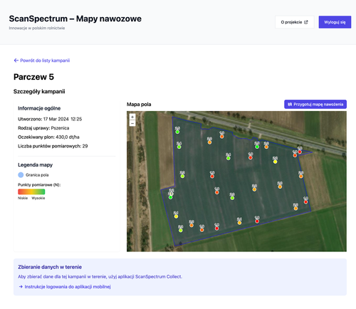Data collected at reference points are automatically transmitted to the server and become immediately available within the web interface, where users can analyze results and monitor progress in real time. Based on these measurements, the system generates nitrogen content maps, divides the field into management zones, and automatically determines fertilizer application rates for each zone.